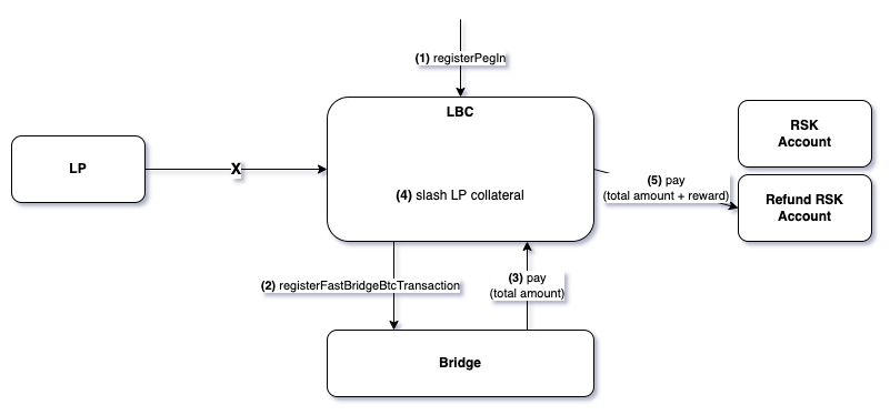 Figure 3 - Fast bridge interactions when the LP fails to call the LBC on behalf of the user. The LBC slashes the LP's collateral and refunds the user on the refund RSK address.