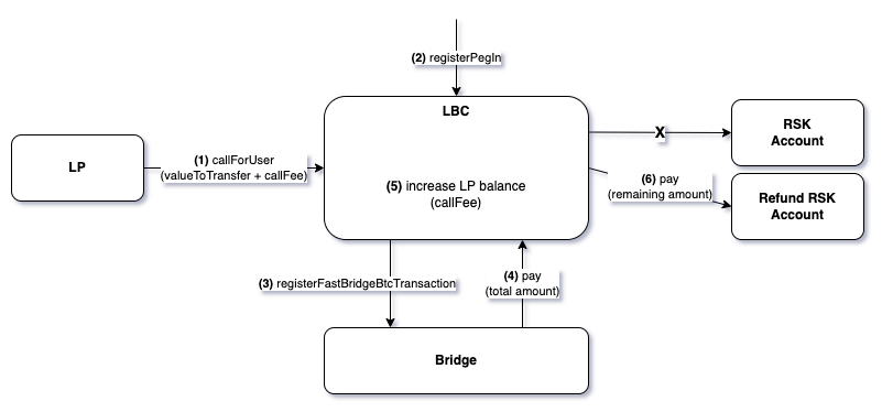 Figure 2 - Fast bridge interactions when the call on behalf of the user is unsuccessful. The LP keeps the call fee and the rest is refunded to the refund RSK address.